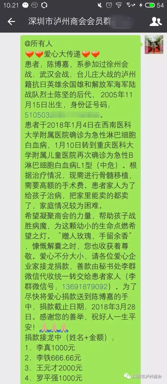 每个孩子都应有一个无忧无虑的美好童年,但泸州市纳溪区的陈博嘉的童年却要经历常人无法想象的苦痛。陈博嘉今年12岁,系参加过徐州会战、武汉会战、台儿庄大战的泸州籍抗日英雄余国雄以及中国人民解放军海军陆战队烈士陈坚的亲属,于2018年1月4日在西南医科大学附属医院不幸确诊为急性淋巴细胞白血病,1月10日转到重庆医科大学附属儿童医院再次确诊为急性B淋巴细胞白血病L1型(中危)。根据治疗情况,需要进行骨髓移植。高额的医药费让这个普通的家庭无法承受,患者家人为了给孩子治病,把家里能卖的都卖了,希望能为陈博嘉凑足骨髓移植医药费。深圳市泸州商会的企业家们在了解陈博嘉病情及家庭相关情况之后,在商会发起了《让爱撑起一片蓝天——关于救助白血病患儿陈博嘉的倡议书》,动员商会力量献出爱心,挽救生命。